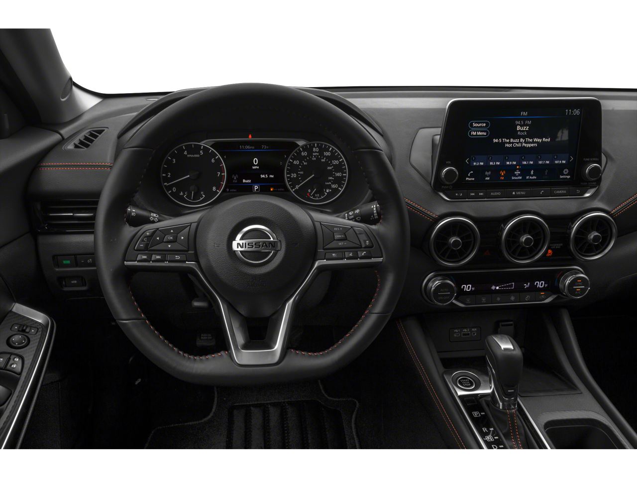 Lighting Package (External Ground Lighting and Interior Ambient Lighting), 18 Alloy Wheels, 4-Wheel Disc Brakes, 6 Speakers, ABS brakes, Air Conditioning, Alloy wheels, AM/FM radio: SiriusXM, Auto High-beam Headlights, Automatic temperature control, Blind Spot Warning, Brake assist, Bumpers: body-color, Carpeted Floor Mats w/Trunk Mat, Clear Rear Bumper Protector, Delay-off headlights, Door Sill Plates, Driver door bin, Driver vanity mirror, Dual front impact airbags, Dual front side impact airbags, Electronic Stability Control, Four wheel independent suspension, Front anti-roll bar, Front Bucket Seats, Front Center Armrest, Front dual zone A/C, Front fog lights, Front reading lights, Fully automatic headlights, Heated door mirrors, Illuminated entry, Knee airbag, Leather Shift Knob, Low tire pressure warning, NissanConnect featuring Apple CarPlay and Android Auto, Occupant sensing airbag, Outside temperature display, Overhead airbag, Overhead console, Panic alarm, Passenger door bin, Passenger vanity mirror, Power door mirrors, Power steering, Power windows, Radio data system, Radio: AM/FM w/RDS/MP3/Aux-In, Rear anti-roll bar, Rear Parking Sensors, Rear seat center armrest, Rear side impact airbag, Rear window defroster, Remote keyless entry, Security system, Speed control, Speed-sensing steering, Split folding rear seat, Spoiler, Sport Cloth Seat Trim, Steering wheel mounted audio controls, Tachometer, Telescoping steering wheel, Tilt steering wheel, Traction control, Trip computer, Turn signal indicator mirrors, and Variably intermittent wipers.