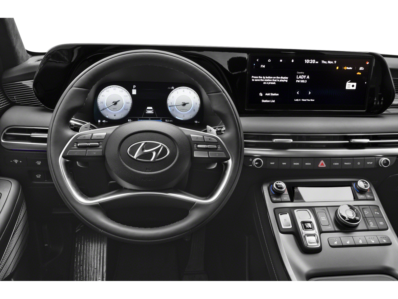 - Radio: AM/FM/MP3 Premium Audio System -inc: 630-Watts, Harman Kardon audio system w/12-speakers, Quantum Logic Surround, Clari-Fi, 12.3" color touchscreen display, onboard navigation w/traffic flow including incident data via HD Radio (HERE), Over-the-Air (OTA) map updates, SiriusXM, Android Auto and Apple CarPlay, USB, dynamic voice recognition, rear seat quiet mode, passenger talk (in-car intercom), Bluetooth® hands-free connectivity w/multiple device connection and Bluelink Connected Car System